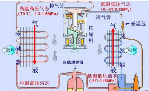 排氣溫度過高將產生一系列的問題,例如引起潤滑油變質或形 成酸性物質,從而引發電機或軸承的故障。蒸發溫度越低,排氣溫度就越高。為了防止過高的排氣溫度,應使壓縮機運行在 相應于不同的制冷劑的規定使用范圍內。對于使用R22制冷劑并且蒸發溫度低于-20℃時如果半封閉壓縮機,采用強制冷卻系統 (閥噴液冷卻系統)這是一種防止排氣溫度過高的有效措施。